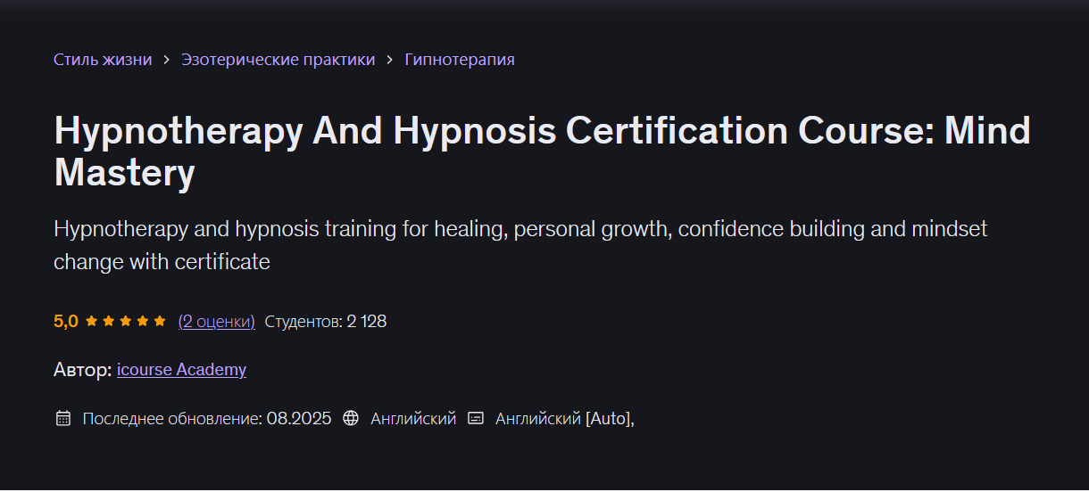 Обучение гипнотерапии и гипнозу для исцеления, личностного роста, повышения уверенности в себе и изменения мышления.